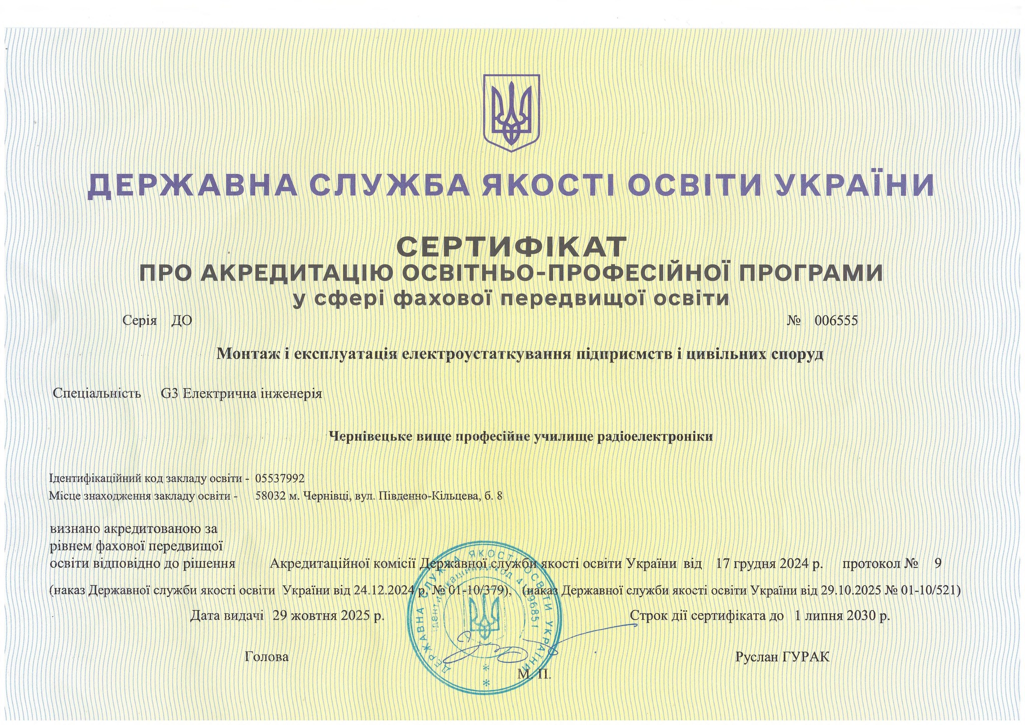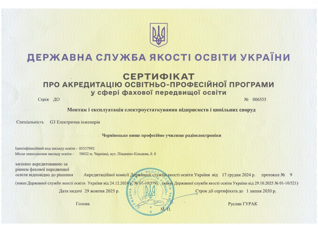 Сертифікат про акредитацію освітньо-професійної програми «Монтаж і експлуатація електроустаткування підприємств і цивільних споруд» (спеціальність G3 «Електрична інженерія») офіційно переоформлено.