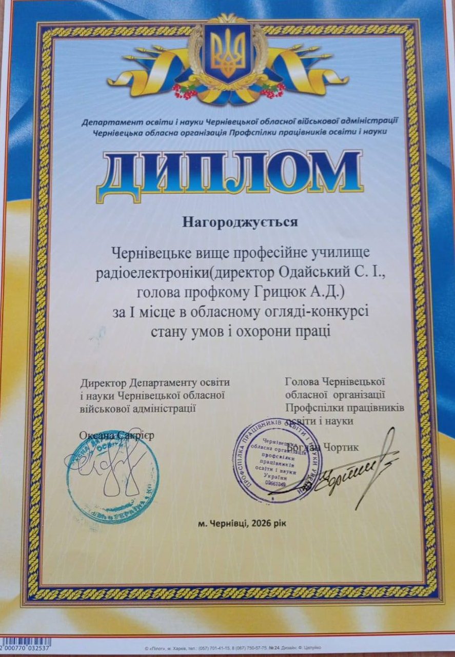 Перемога, яка належить кожному! Сьогодні наше Чернівецьке вище професійне училище радіоелектроніки отримало високе визнання – Диплом за І місце в обласному огляді-конкурсі стану умов і охорони праці. Ця нагорода — не просто офіційний документ. Це результат щоденної, сумлінної та злагодженої роботи всього нашого колективу. Адже безпечне освітнє середовище створюється не наказами, а спільними зусиллями кожного […]